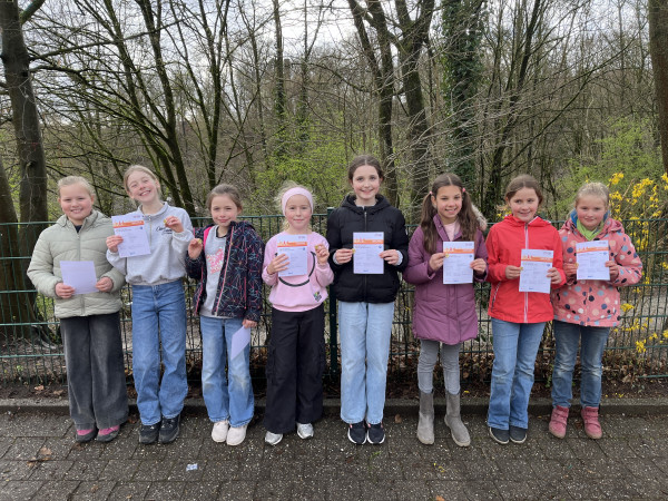 Auf dem Foto sind die stolzen Gold-Gewinner aus Klasse 3 und 4 zu sehen.